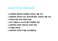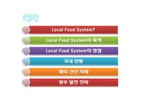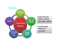 목차 1. Local Food System? 2. Local Food System의 목적 3. Local Food System의 장점 4. 국내 현황 5. 해외 선진 사례 6. 향후 발전 전략 본문 ▶지역에서 생산되어 지역에서 소비되는 먹을 거리 ⦁▶생산자와 소비자가 아는 관계 속에 생산, 소비되는 먹을 거리 ⦁▶지역의 역사, 문화, 특성이 반영 ⦁▶푸드 마일(food mile)이 짧고 지역에서 순환 ⦁▶생산자와 소비자 간에 중간 단계가 적음 ⦁▶포장을 적게 함 ⦁▶생산자와 소비자가 먹을 거리 통제가능 <중략> 원주 – 새벽시장 1994년 농민들과 원주 공무원들의 노력으로 시작 13개 구역이 정해져 있고 정기적으로 자리 바꿈 농민들은 협의회에서 제작한 명패에 주소와 실명을 기록해 생산자 실명제 및 리콜제 실시 농민 회원제로 운영 2007년 농림부 농산물 직거래장터 평가에서 최우 수기관 선정 여주 제천 횡성 충주 등 인근 지역 소비자도 모임 하고 싶은 말 Local Food System의 이해 및 사례 키워드 Local Food System의 이해 및 사례, Local Food, Local Food System, 푸드 마일, 로컬푸드 |